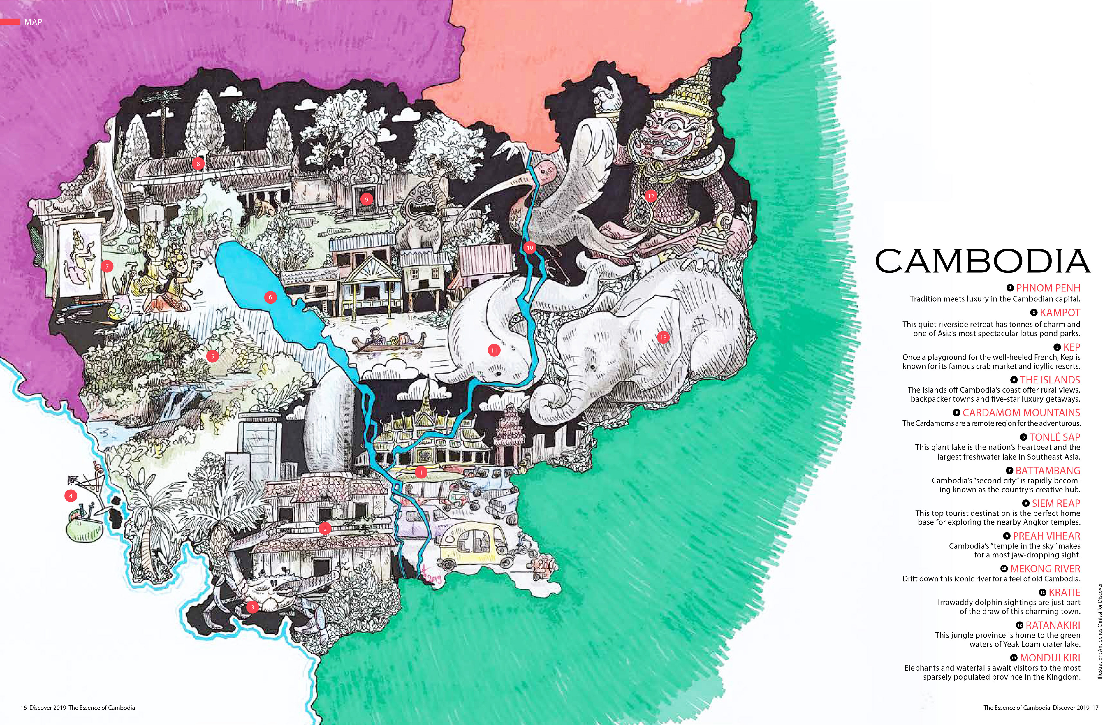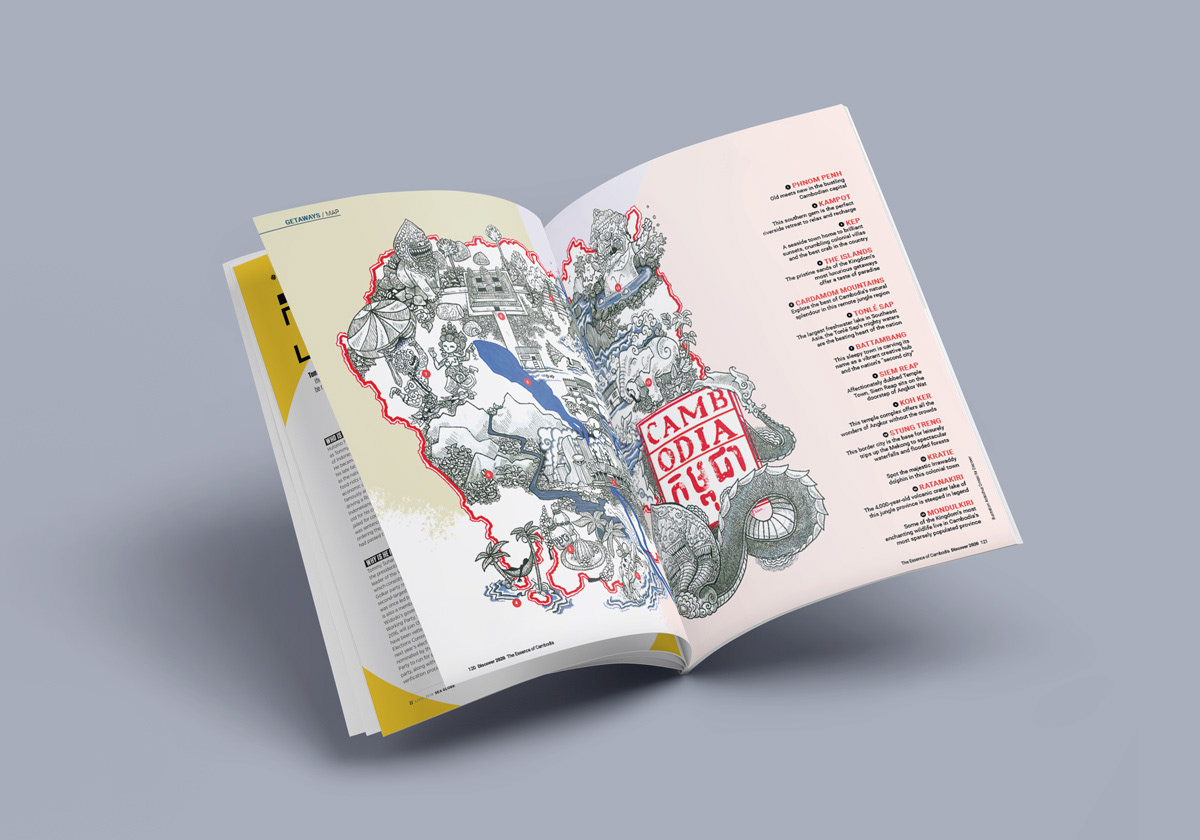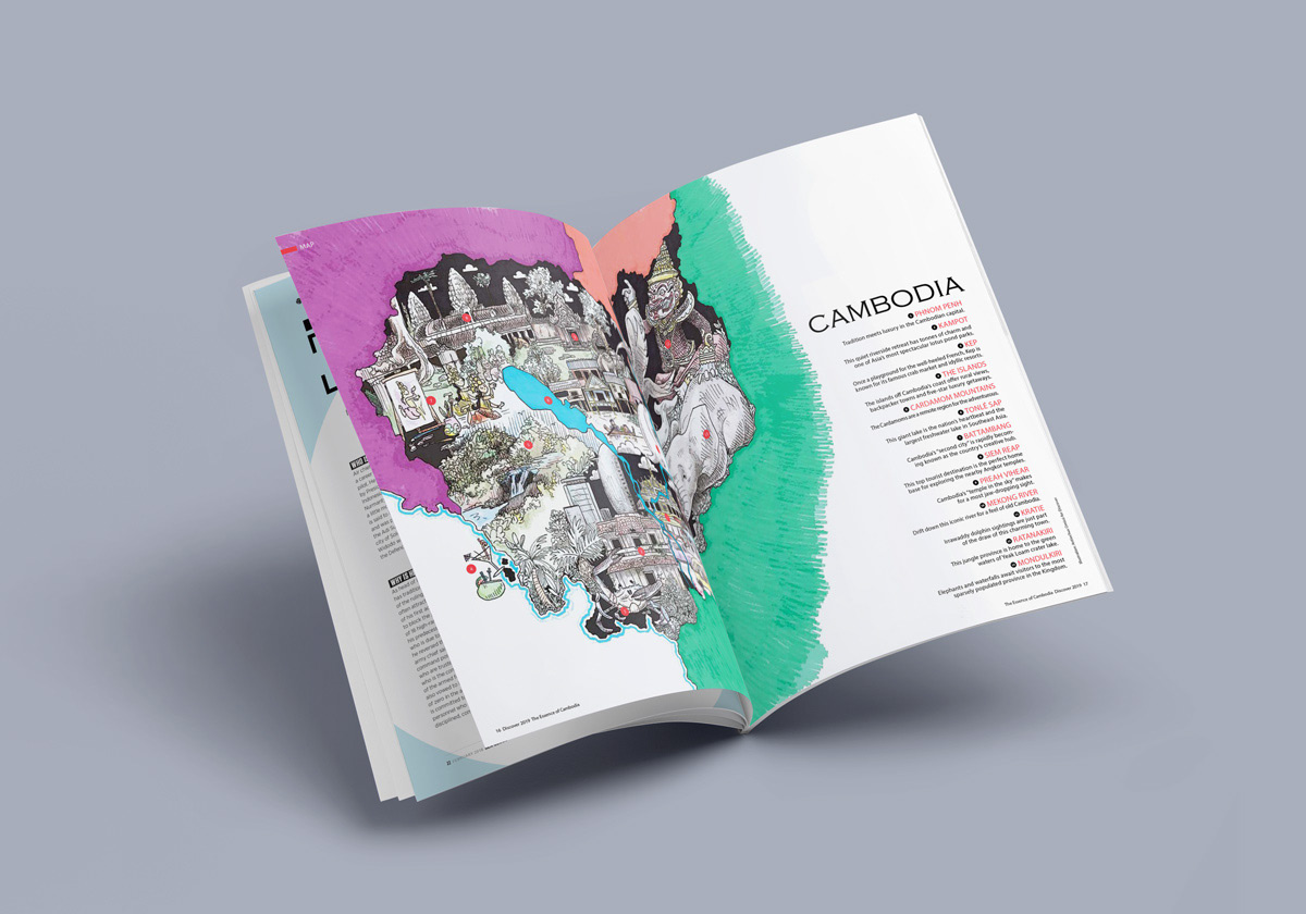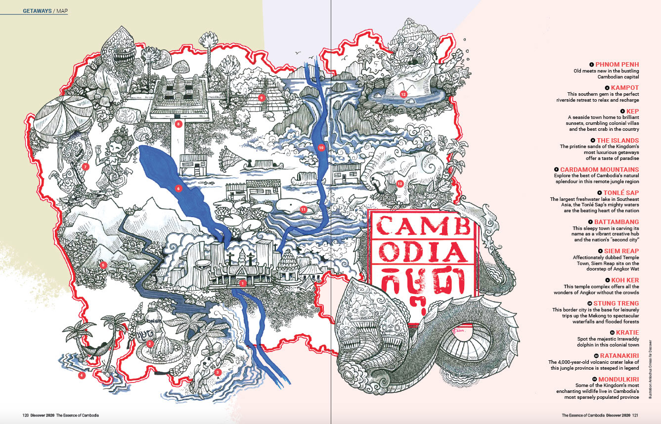 Maps of Cambodia for the opening pages of Discover magazine, a popular resource for information regarding travel and culture in the Kingdom of Wonder.