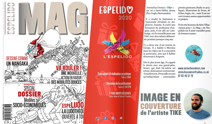 Cover illustration and short profile in the bi-annual magazine of Espelido, a social and cultural centre in Montfavet (France). Read Espelido MAG using the button below. Illustration de la couverture et descriptif dans le magazine semestriel du centre social et culturel L'Espelido à Montfavet (Vaucluse). Cliquez sur le bouton ci-dessous pour lire le MAG de L'Espelido.