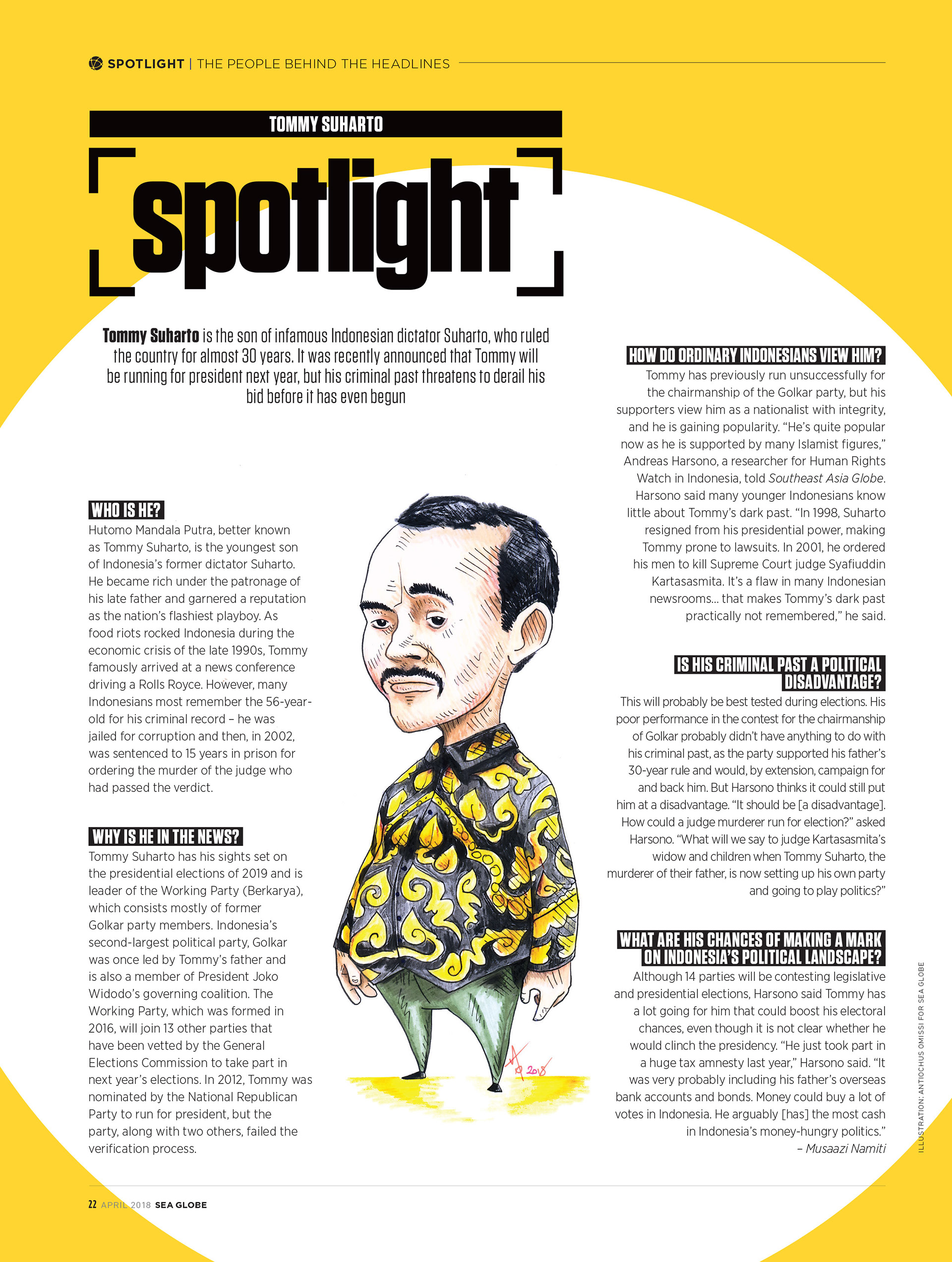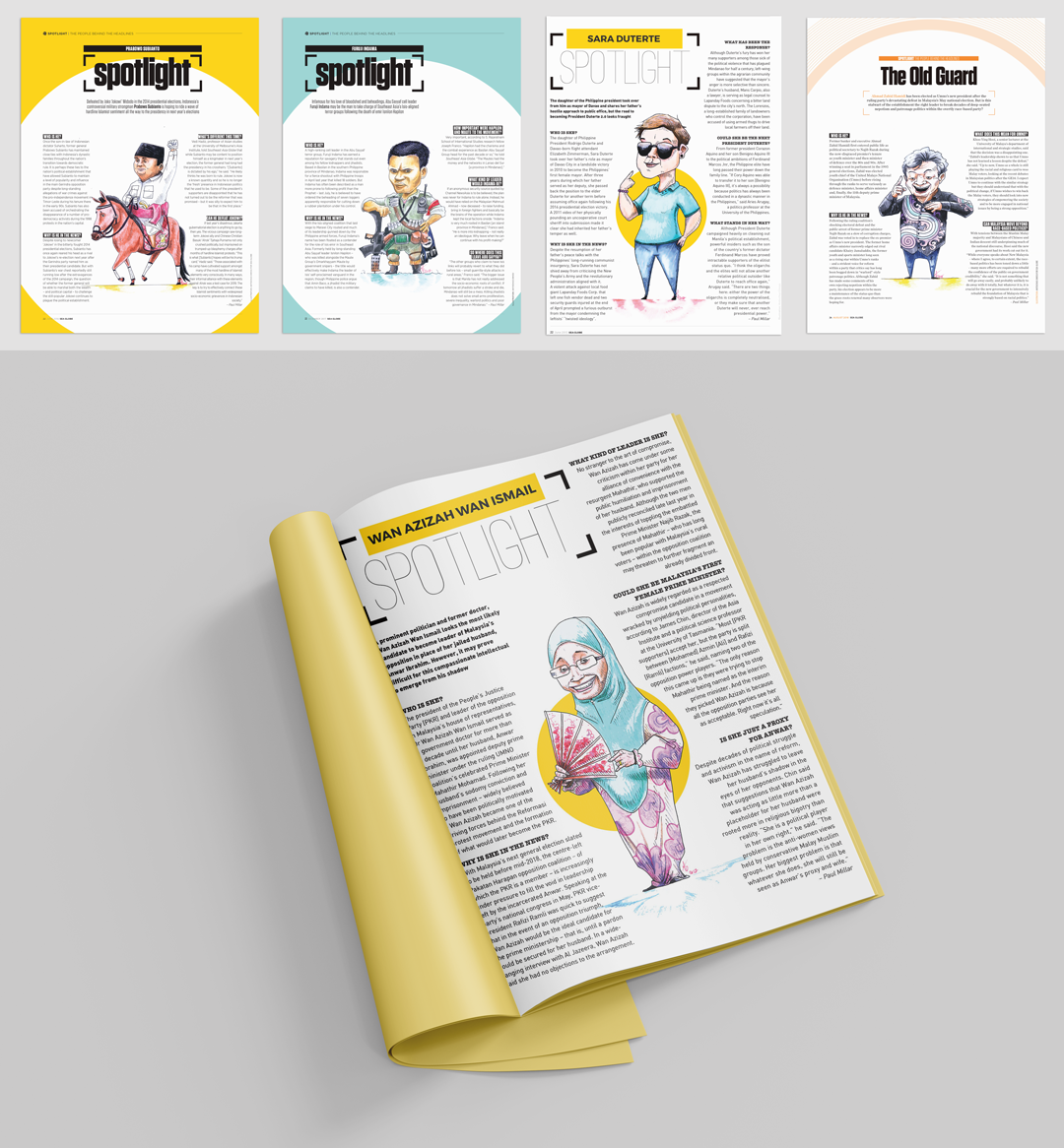 (A selection of) caricatures of influential political figures in South East Asia who largely kept out of the public eye and were therefore not commonly photographed. Illustrations published in every edition of the monthly magazine before the South East Asia Globe moved online.